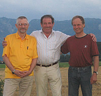 Foto: (P3Vorstand.jpg) Nach der erfolgreichen Errichtung einer 10 kWp Phototovoltaik Anlage auf dem Dach der neuen Sporthalle in Mitterfelden bespricht der Vorstand des Bürgersonnenkraftwerkes Ainring die Einweihungsfeier und die nächsten Projekte. Von links: Schriftführer Hermann Schubotz, Technischer Vorstand Siegfried Eschlberger, Erster Vorstand Georg Thesz. Januar 2002 |